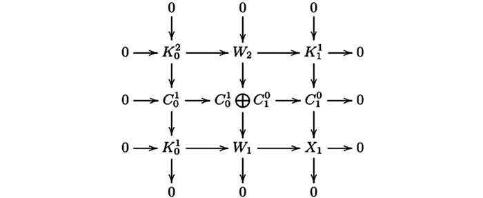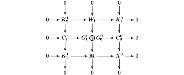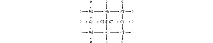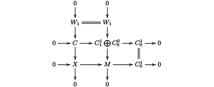 $ {W_2} = {\rm{Ker}}\left( {C_0^1 \oplus C_1^0 \longrightarrow {W_1}} \right) $ .因为图 10的第二行与第三行是Hom$ \mathscr{A} $ ($ \mathscr{C} $ ,—)-正合的,所以由文献[4]的引理3.1(1) 得第一行是Hom$ \mathscr{A} $ ($ \mathscr{C} $ ,—)-正合的,其中:由蛇引理可得图 11中第一行与第二列是CE-正合的.因此序列(14) 是CE-正合的.
