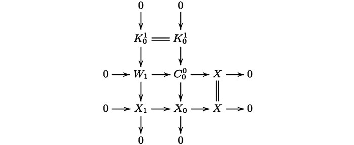 $ {W_2} = {\rm{Ker}}\left( {C_2^1 \oplus C_1^0 \longrightarrow {W_1}} \right) $ ,且图 7中第一行是Hom$ \mathscr{A} $ ($ \mathscr{C} $ ,—)-正合的.根据以上证明可得图 7的第一行与第二列是CE -正合的.重复以上过程可得序列(4) 与(5) 是CE-正合的.(ⅱ)因为CE-正合列(2) 与(3) 是Hom