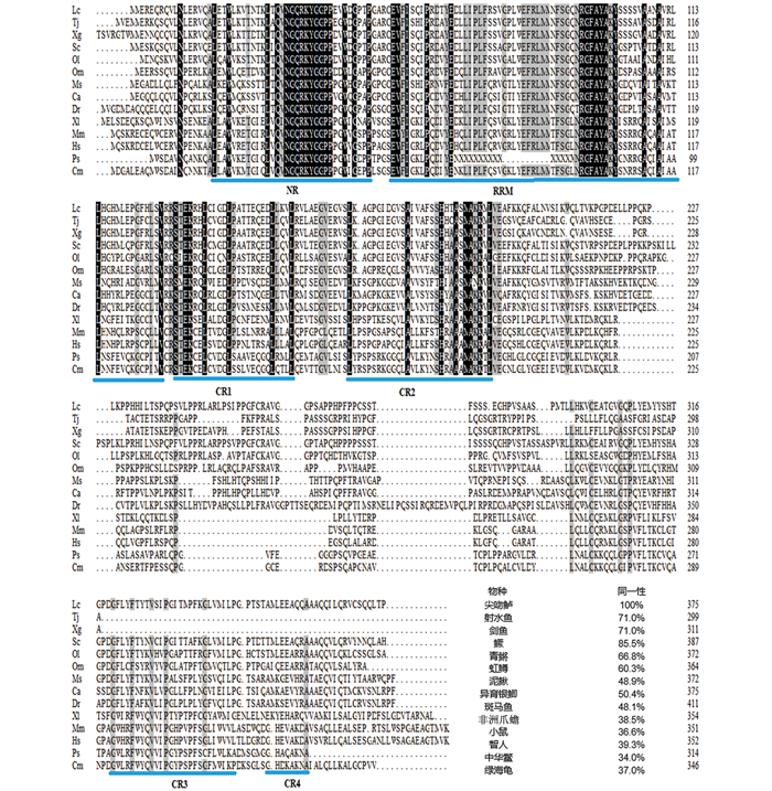 用DNAMAN 8.0软件对尖吻鲈Dnajb1和Dnd1蛋白与其他物种同源蛋白序列进行多重比对,结果发现,尖吻鲈Dnajb1与大口黑鲈同源性最高,为94.1%;与大菱鲆、尼罗罗非鱼和青鳉的同源性在90.0%~92.8%;与斑马鱼的同源性为76.6%;与两栖动物非洲爪蟾、爬行动物绿海龟和蜥蜴的同源性在70.4%~71.0%;与哺乳动物(智人、小鼠、穴兔)的同源性在69.5%~71.0%;与鸟类原鸡的同源性最低,为66.4%(图 2)。尖吻鲈与其他物种的Dnajb1氨基酸序列具有高度的保守性,即都具有DNAJ结构域和DNAJ-C保守结构域。尖吻鲈Dnd1与鳜的同源性最高,为85.5%;与射水鱼和剑鱼的同源性都是71.0%;与青鱂、虹鳟、异育银鲫、斑马鱼和泥鳅的同源性在48.1%~66.8%;与智人和小鼠的同源性分别为39.3%和36.6%;与非洲爪蟾、中华鳖和绿海龟的同源性在34.0%~38.5%(图 3)。尖吻鲈与其他物种的Dnd1氨基酸具有高度的同源性,即1个RRM识别基序结构域和5个保守结构域(NR、CR1、CR2、CR3、CR4)。