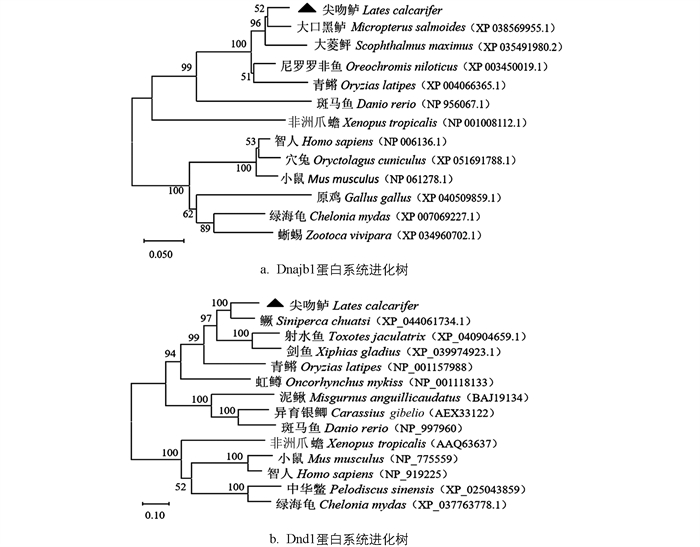 基于尖吻鲈和其他物种Dnajb1和Dnd1的氨基酸序列,通过Mega 11.0采用邻接法构建系统发育进化树,结果显示,尖吻鲈Dnajb1属于Hsp40家族,主要分为低等脊椎动物和高等脊椎动物两大支。Dnajb1与硬骨鱼类聚为一支,与鱼类同源性较高,与鸟类、爬行类和哺乳类同源性较低(图 4a);Dnd1主要聚为四足动物和硬骨鱼类两大分支,尖吻鲈Dnd1属于硬骨鱼类,与鱼类的同源性较高,与哺乳类的同源性较低,与龟、鳖类的同源性最低(图 4b)。