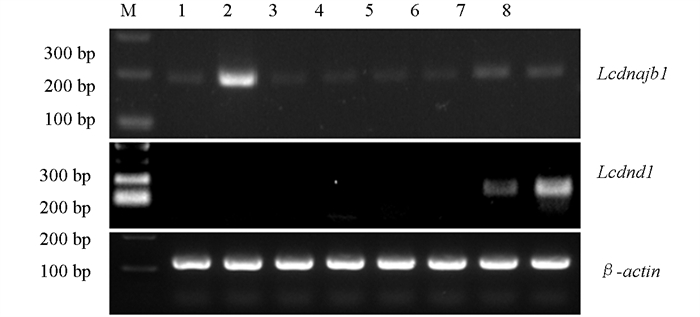 • 根据获得的尖吻鲈dnajb1dnd1 cDNA序列设计特异性扩增引物Lcdnajb1-rt-F/R和Lcdnd1-rt-F/R(表 1),选用β-actin(XM_018667666.2)作为内参基因,设计引物β-actinF/R(表 1)。以尖吻鲈肠、脑、心、肝、脾、肾、精巢和卵巢组织cDNA为模板(稀释5倍后使用)进行RT-PCR扩增。反应体系为20 μL(10 μL 2×Taq Mix,引物各1 μL,模板1 μL,ddH2O添加至20 μL)。RT-PCR循环条件为:94 ℃预变性2 min;94 ℃变性30 s,60 ℃退火30 s,72 ℃延伸30 s,循环数为32;最后72 ℃延伸5 min。PCR产物进行琼脂糖凝胶电泳检测,并在生物成像系统(Bio-Rad)中进行观察。