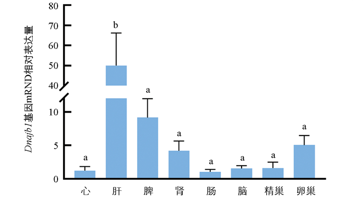 • 采用RT-PCR检测尖吻鲈Lcdnajb1Lcdnd1基因在不同组织中的表达,结果显示,Lcdnajb1在心、肝、脾、肾、肠、脑、精巢、卵巢中均有表达,肝中表达量最高,精巢和卵巢中的表达量次之,其他组织中的表达量相对较低;Lcdnd1仅在性腺组织中表达,且卵巢中的表达量高于精巢,其他组织中检测不到(图 5)。进一步采用qRT-PCR检测Lcdnajb1基因的组织表达,结果显示,肝脏中的表达最高(图 6),显著高于其他组织,检测结果同RT-PCR中的结果类似。