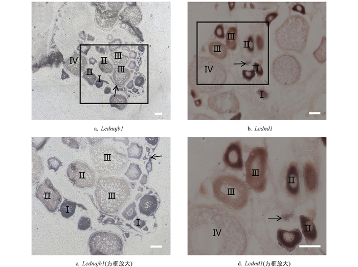 • 采用化学原位杂交检测Lcdnajb1Lcdnd1在尖吻鲈卵巢中的表达定位,结果显示,dnajb1基因主要在雌性生殖细胞的第Ⅱ、Ⅲ期表达,而在Ⅳ期表达量开始减弱。有趣的是,成熟尖吻鲈的dnd1基因表达呈现出与Lcdnajb1基因类似的特征,即集中在雌性生殖细胞的第Ⅱ、Ⅲ期表达,Ⅳ期表达减弱。不同的是,Lcdnajb1在体细胞和生殖细胞中均有表达,而Lcdnd1仅在生殖细胞中表达,体细胞中几乎不表达(图 7)。
