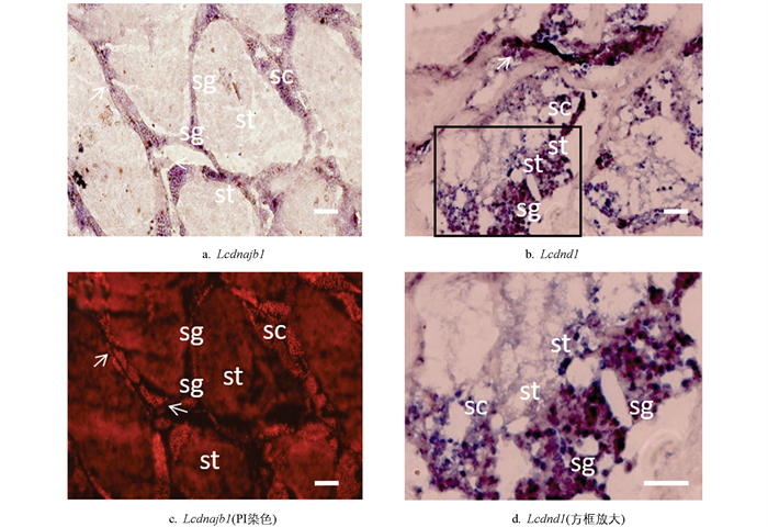 • 采用化学原位杂交检测Lcdnajb1Lcdnd1在尖吻鲈精巢中的表达定位,结果显示,Lcdnajb1在雄性生殖细胞和体细胞中均有表达,而Lcdnd1仅在生殖细胞中表达,其他细胞中检测不到。Lcdnajb1在精原细胞和精母细胞中表达强烈,精子细胞中表达减少。Lcdnd1在生殖细胞中也出现相应的表达特征,但在精子中几乎检测不到(图 8)。