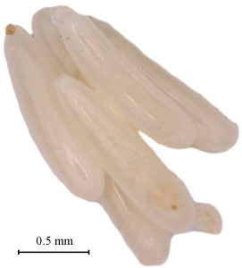 • 利用配制的饲料吸引蝇虫进行产卵。实验室培养的卵为乳白色,呈椭圆形米粒状,100粒卵的长度均在1~1.5 mm范围,宽度在0.25~0.35 mm范围(图 1)。在实验室环境中,当温度控制在30 ℃,光照条件为12 L(光亮)∶12 D(黑暗),湿度保持在70%时,卵期约13 h。卵孔位于卵一端,呈圆形。