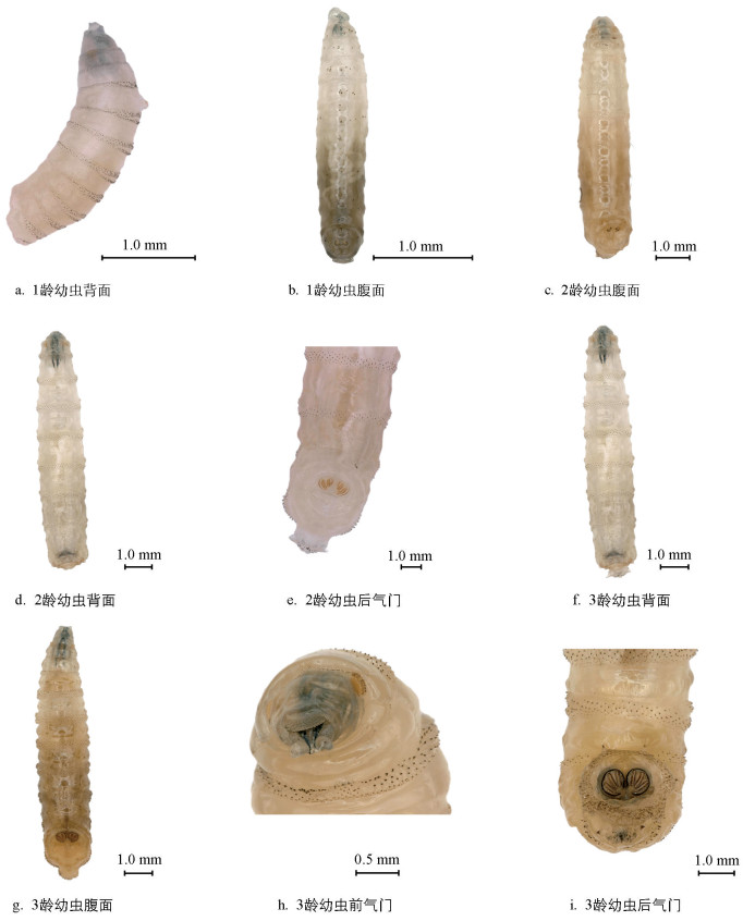 • 幼虫呈蠕虫状,体色介于淡黄色与乳白色之间,体表光滑,身体近透明,消化道清晰可见,虫体有12节,前尖后粗。在第二节段和第三节段之间观察到前螺旋瓣,有10~12个螺旋瓣分支和孔,幼虫第三节的刺呈单尖排列(图 2a)。在腹面终末节的水平面上有两个棕色圆形区域是后气门。幼虫尾节的边缘被突起包围,称为结节。不同的幼虫期通过后气孔裂口数量来确定,分为3龄。
