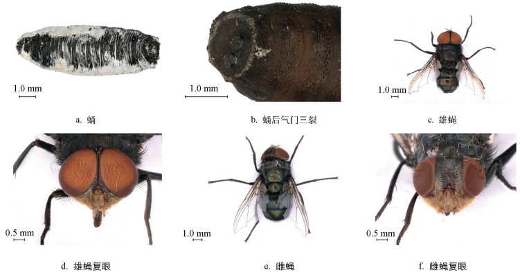 • 成虫属于中型类群,50只成虫体长均在9~10 mm范围,体呈金属绿色,具强光泽。头部可自由转动,口器为典型舔吸式,口器周围鬃毛丛发达。颊部呈现出杏黄至橙色的渐变色调,颊毛呈黄色。胸部具铜绿金属光泽,前盾片覆薄层灰白色毛,侧片覆黑毛,后小盾片退化。腹部呈蓝绿铜色,各背板(除第5节)具紫黑后缘带,第1腹板具黄毛,其余腹板及背板侧缘呈现出黄黑毛混生足基节紧密排列,后基节与触角密布刚毛。翅膜透明,翅脉及腋瓣呈棕色调(图 3c,雄蝇)。