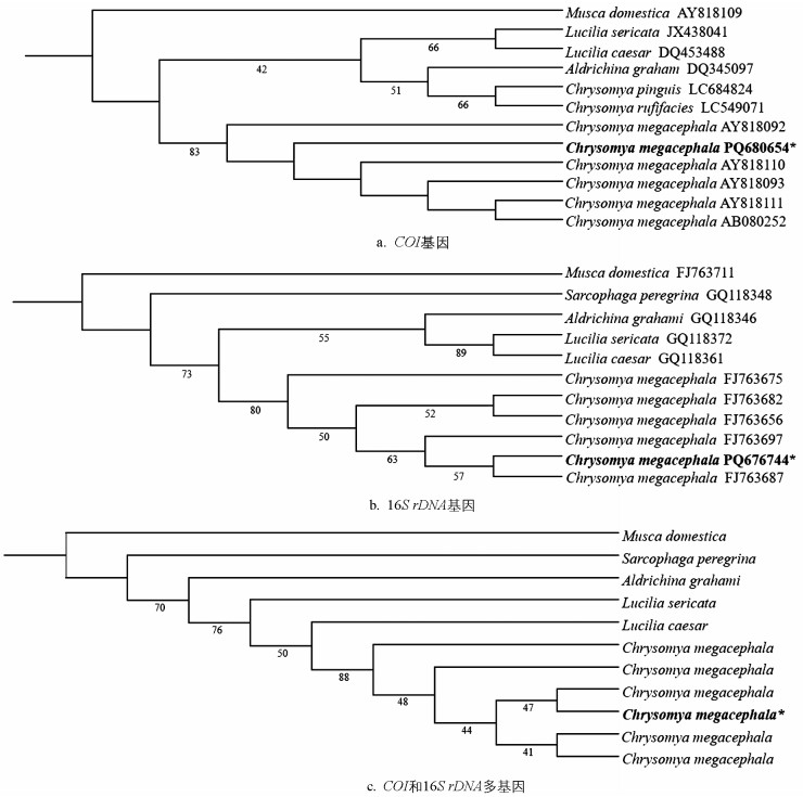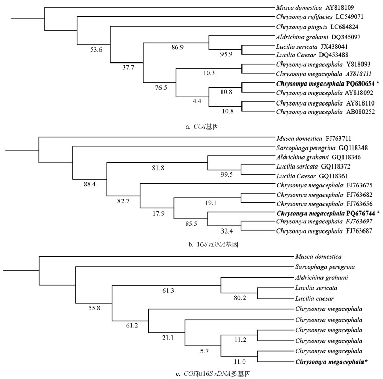 在美国国家生物技术信息中心(NCBI)上下载蝇科家蝇(Musca domestica)COI序列和16S rDNA序列作为外群,根据形态及基因遗传距离分析待鉴定物种为丽蝇科金蝇属的大头金蝇(Chrysomya megacephala)。在麻蝇科中下载棕尾别麻蝇(Sarcophaga peregrina)16S rDNA序列;在丽蝇科中分别下载与鉴定物种相似及相关种的COI序列和16S rDNA序列:绿蝇属的丝光绿蝇(Lucilia sericata)、叉叶绿蝇(Lucilia caesar),阿丽蝇属的巨尾阿丽蝇(Aldrichina graham),金蝇属的肥躯金蝇(Chrysomya pinguis)、裸金蝇属的绯颜裸金蝇(Chrysomya rufifacies)及6个大头金蝇(Chrysomya megacephala)数据(确保待鉴定物种序列的准确性),采用PhyloSuite V 1.2软件对以上12个COI序列、11个16S rDNA序列(肥躯金蝇、绯颜裸金蝇无16S rDNA序列)进行单基因建树(图 4ab图 5ab)和多基因建树(图 4c图 5c)分析。IQ-TREE和MrBayes两种方法构建的系统发育树均显示:以家蝇(Musca domestica)为外群时,待鉴定样本与大头金蝇在3种基因树上均形成高置信度分支(COI:83%、76.5%,16S rDNA:80%、82.7%,多基因:88%、61.2%),而与丽蝇科其他物种显著分离(图 4图 5)。在丽蝇属中,丝光绿蝇(Lucilia sericata)与叉叶绿蝇(Lucilia caesar)在部分进化树中聚为一支,获得66%、89%等Bootstrap支持率,体现了较近的亲缘关系;金蝇属的大头金蝇(Chrysomya megacephala)多个序列形成明显聚类分支,其中待测序列PQ680654与大头金蝇序列分支支持率达83%,且在图 5带置信值的进化树中分支数值进一步验证了聚类可靠性;阿丽蝇属的巨尾阿丽蝇(Aldrichina graham)亦呈现出独立分支特征。进化树结果、分子系统学分析结果与BLAST比对结论一致,明确支持待测样本为大头金蝇的物种鉴定。