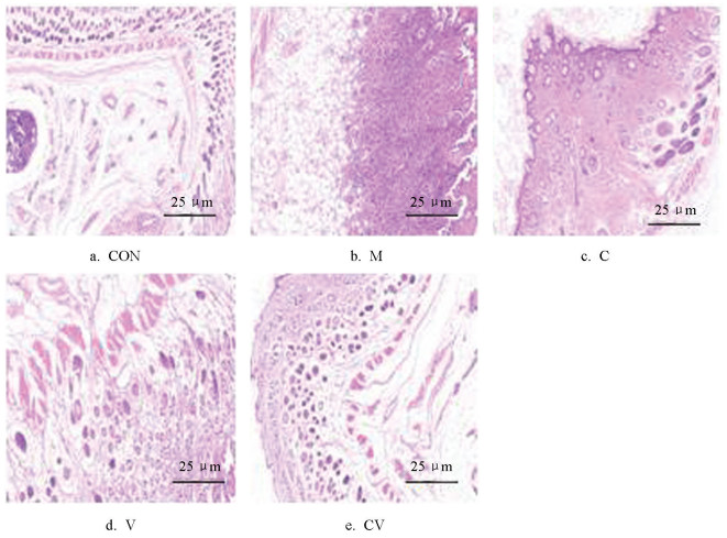 • 50只SPF级ICR小鼠,随机分为空白对照组(CON)、模型组(M)、黄连组(C)、蜂房组(V)、黄连蜂房组(CV),每组10只。造模方法参照文献[18],各组小鼠实验前一天用剃须刀进行腹部剃毛,范围约为2 cm×2 cm。采用2,4-二硝基氯苯(DNCB)腹部致敏和耳部反复激发小鼠建立湿疹模型。除空白组外,其余组小鼠涂含有7% DNCB的丙酮橄榄油溶液(4∶1)100 μL致敏,末次致敏5 d后于小鼠双耳内外侧耳面均匀涂以0.5%DNCB溶液20 μL进行多次激发,1次/3 d,连续4次。空白组小鼠腹部及双耳均涂以丙酮橄榄油溶液(4∶1)对照,以相同的方式及相同的量进行涂抹。