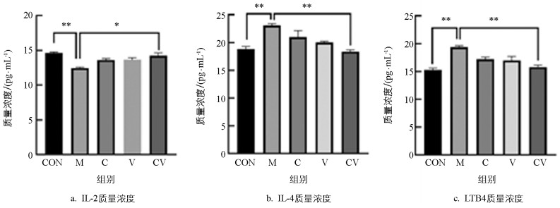 • 通过ELISA试剂盒对血清中的IL-2、IL-4及LTB4质量浓度进行检测。重复3次实验。