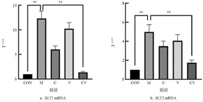 图 5  黄连蜂房对慢性湿疹小鼠皮损组织BLT1和BLT2 mRNA表达的影响