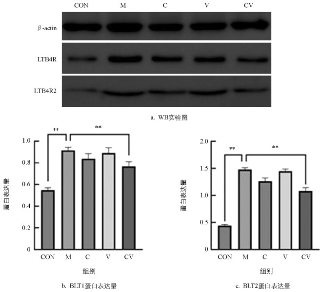 • 用ImageJ软件对WB条带进行灰度分析,以β-actin为内参蛋白,分别计算LTB4R/β-actin和LTB4R2/β-actin的比值,WB结果(图 6)显示:与空白对照组相比,LTB4R和LTB4R2蛋白在模型组慢性湿疹小鼠中的表达极显著增高(p<0.01);与模型组相比,LTB4R蛋白和LTB4R2蛋白在黄连蜂房组慢性湿疹小鼠中的表达极显著降低(p<0.01)。