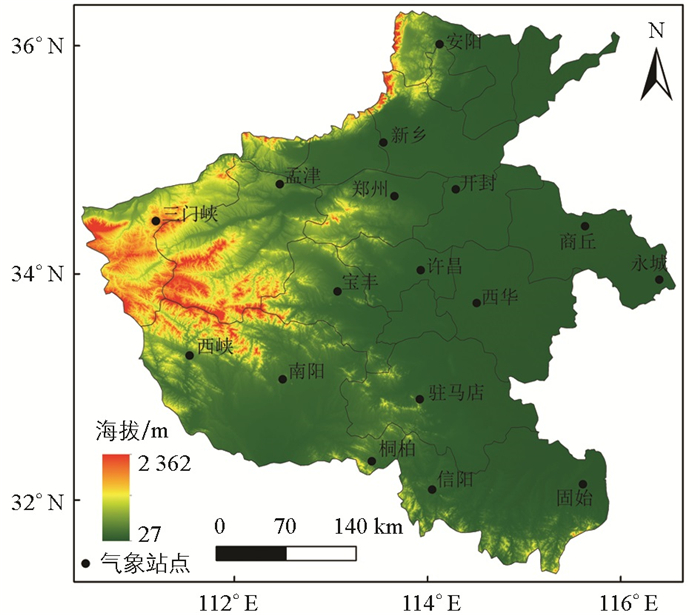 • 河南省17个气象站点(图 1)1960-2020年逐日气温、风速和相对湿度数据来自中国气象科学数据共享服务网(http://data.cma.cn)中国地面气候资料日值数据集。根据河南省的气象特点,四季划分为:3-5月为春季,6-8月为夏季,9-11月为秋季,12月至次年2月为冬季。