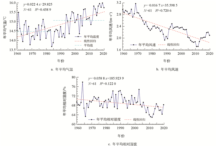 • 1960-2020年河南省年平均气温、风速和相对湿度变化如图 2所示,由图 2a可知,近61 a河南省年平均气温为13.68~16.00 ℃,多年均值为14.84 ℃,2019年最高,1984年最低。从变化趋势来看,近61 a来河南省年平均气温以0.22 ℃/10 a的倾向率呈波动上升趋势。1960-1984年河南省平均气温偏低,平均为14.48 ℃,1985年后,平均气温为15.09 ℃,较之前上升0.61 ℃。1960-2020年河南省年平均风速为2.36 m/s(图 2b),1969年最大为3.17 m/s,2012年最小为1.72 m/s。近61 a河南省平均风速变化总体呈现下降趋势,倾向率为-0.17 (m·s-1)/10 a,其中1969-1989年和2004-2012年河南省年平均风速下降趋势明显,风速逐渐减小,2012年以来平均风速略有回升。