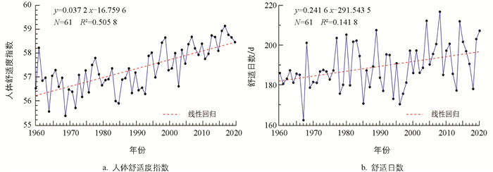 图 3  1960-2020年河南省人体舒适度指数和舒适日数变化