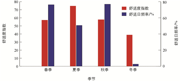 • 河南省人体舒适度指数和舒适日频率四季变化如图 4所示,河南省舒适度指数在夏季最高,为74.83,之后依次为秋季(57.96)、春季(57.32)和冬季(38.93)。从舒适日频率来看,近61 a全省年舒适日数平均为189.23 d,舒适日频率为51.67%,其中秋季和春季的舒适日频率相对较高,分别为77.08%、76.19%,夏季为50.68%,冬季最低,为2.72%。