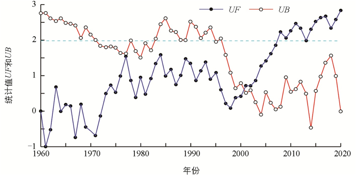 • 1960-2020年河南省舒适日数Mann-Kendall突变检验曲线如图 5所示,近61 a来河南省舒适日数正序列UF曲线整体呈波动上升趋势,反序列UB曲线呈下降趋势,二者相交于2001年,突变点在信度线内,确定其突变点为2001年,突变发生前河南省舒适日数平均为185.92 d,突变后为196.03 d,较突变前增加了10.11 d。