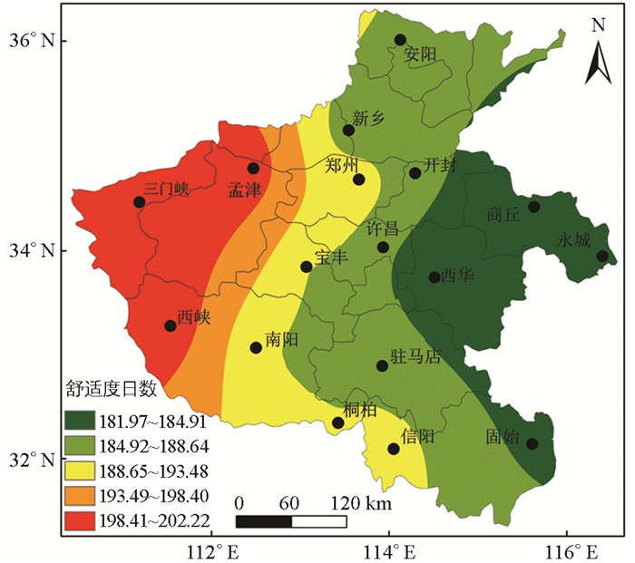 • 1960-2020年河南省舒适日数空间分布情况如图 6所示,河南省舒适日数为181.97~202.22 d,大体呈自西向东依次递减趋势,西部地区三门峡、孟津和西峡等站舒适日数在198.40 d以上,中部地区许昌和驻马店等站为184.92~188.64 d,东部地区永城和商丘等站在184.91 d以下。