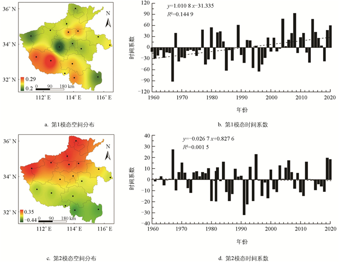 • 对河南省17个气象站点近61 a的舒适日数进行EOF分析,前4个特征值及方差贡献率如表 3所示。第1个模态方差贡献率为79.09%,远大于其他模态,第2至第4个模态方差贡献率依次为5.19%、2.90%和2.21%,第4个模态之后的其他模态贡献率相对较小。前4个模态的累积方差贡献率达到了89.39%,因此这4个特征值所对应的特征向量可以很好地解释1960-2020年河南省舒适度日数的分布类型。其EOF特征向量场分布及对应的时间系数如图 7所示。