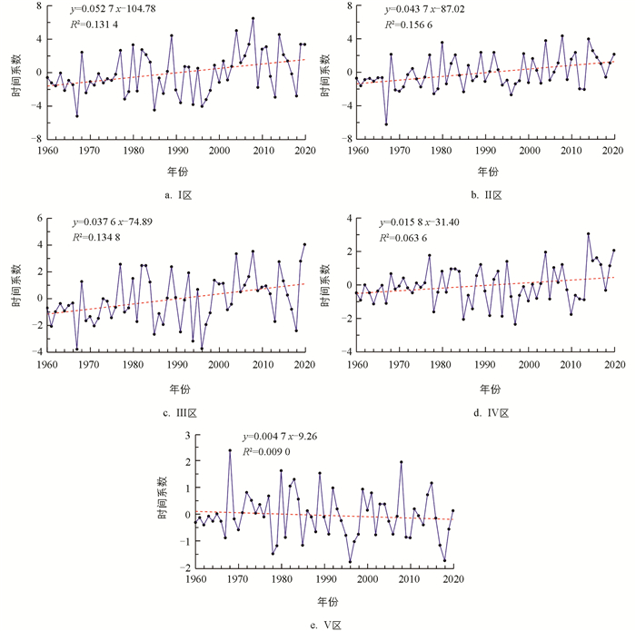 Ⅴ区舒适日数呈小幅下降趋势(图 9e),1960-1966年舒适日数相对平稳,1966年后,舒适日数波动较大。1967、1978、1985、1996、2018年Ⅴ区舒适日数出现低谷,其中2018年舒适日数最少,1968、1981、1988、2008、2014年舒适日数出现峰值,其中1968年舒适日数最多。观察Ⅴ区舒适日数时间系数发现,正值年份为26 a,负值年份为35 a,说明近61 a来该区舒适日数整体偏少。