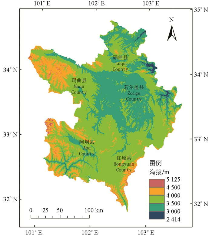 • 若尔盖草原位于中国青藏高原东北部边缘(33°10′-34°06′N,101°36′-103°25′E),其覆盖范围包括四川省的若尔盖县、阿坝县和红原县以及甘肃省的碌曲县和玛曲县,共5个县(图 1)[27]。当地海拔2 414~5 125 m,总面积约为42 783 km2,地貌特征显著,以丘状高原为主,并发育有低山、阶地、河漫滩等多种地貌类型,是青藏高原上面积最大的高原沼泽湿地分布区。植被类型丰富,以沼泽植被和草甸植被为主,受气候变化等因素影响,荒漠化及沙化的草地面积持续扩大[22, 30]。研究区内主要水系由黄河及其支流构成,其中黄河在塑造高原丘陵地貌的过程中,形成众多的古河道,进而演变为巨大的宽谷,为沼泽的孕育提供得天独厚的自然条件[31]。作为黄河水源的重要补给区,若尔盖草原的生态稳定对于整个黄河源区生态环境建设和社会经济发展有着重要影响。若尔盖草原位于寒温带高原季风气候带,气候特点显著,主要表现为寒冷且湿润,年均气温仅为1.2 ℃,年均降水量为51.9 mm,降水大部分集中在5-9月,占年降水量的70%以上。此外,若尔盖地区具有大陆性高原寒温带的气候特征,表现为湿润至半湿润的季风气候,冬季受西风南支流的显著影响,以及来自北方的寒流侵扰,夏秋季节受印度洋和太平洋季风的影响,外加冷低压的常年侵扰,整体呈现出长冬无夏、春秋短暂、雨热同期的气候特征[20]