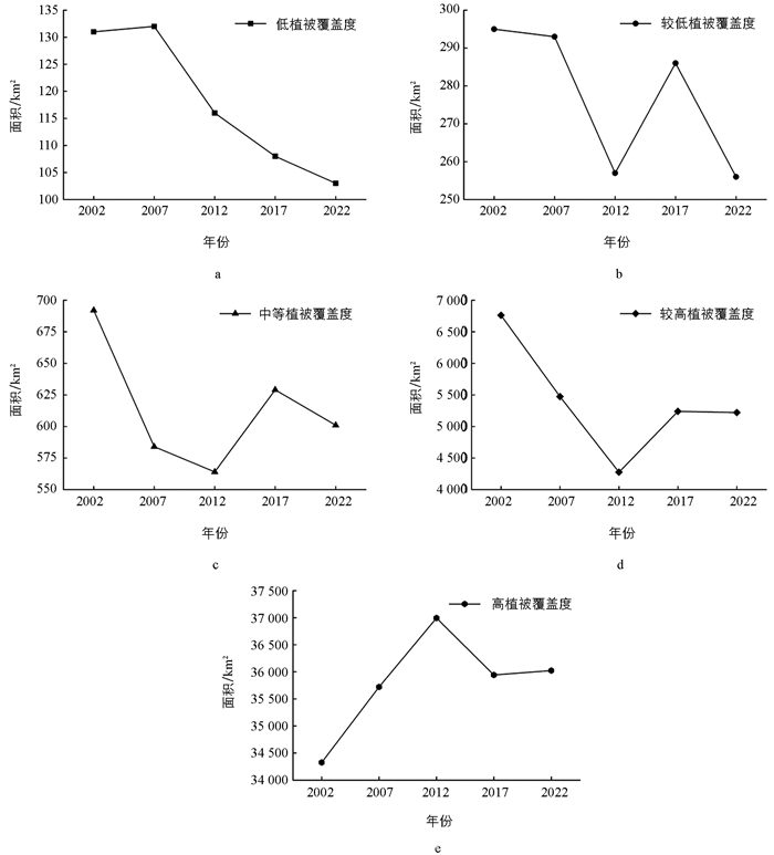 • 根据2002-2022年若尔盖草原各时段的FVC值即不同类型植被覆盖区统计结果发现,研究区内不同等级FVC面积变化呈现出“四减一增”的趋势(图 2)。其中,高植被覆盖区处于绝对优势,在2002-2022年,该类型面积为34 325.73~36 992.52 km2,占研究区总面积均在80%以上,由81.33%增长至85.36%;其他各类型区域均呈现略微下降趋势,其中低植被覆盖区和较低植被覆盖区的面积极为有限,分别占研究区总面积的0.24%~0.31% 和0.61%~0.70%,并且覆盖面积随时间的增长波动较大;中等植被覆盖区面积为564.27~691.55 km2,占研究区总面积的1.34%~1.64%,最低值出现在2012年,且总体仍呈现缓慢下降趋势;较高植被覆盖区的面积为4 275.52~6 760.72 km2,占研究区总面积的10.13%~16.02%,变化曲线与中等植被覆盖度基本一致。中等植被覆盖区和较高植被覆盖区虽然占据一定的比例,但也呈现出向高植被覆盖区转变的趋势,这一变化模式反映出若尔盖草原生态系统的稳健性及其向更高植被覆盖水平发展的积极趋势。