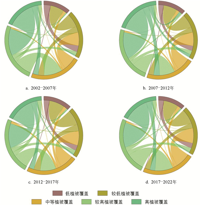 统计2002-2022年间若尔盖草原不同时段内的植被覆盖分级面积转移数据发现,研究区植被覆盖度比较稳定,尤其是高植被覆盖区域,发生转移的面积占比均处于10%以下,远低于其他各类型植被覆盖区域发生转移的比例,且发生转移的区域有90%以上是向较高植被覆盖区转变,未出现成规模的植被退化。中等植被覆盖与较高植被覆盖区域发生转变的比例在60%左右,但这些转变多倾向于更高层次的植被覆盖类型,这表明若尔盖草原的生态环境在一定程度上得到改善(图 3)。
