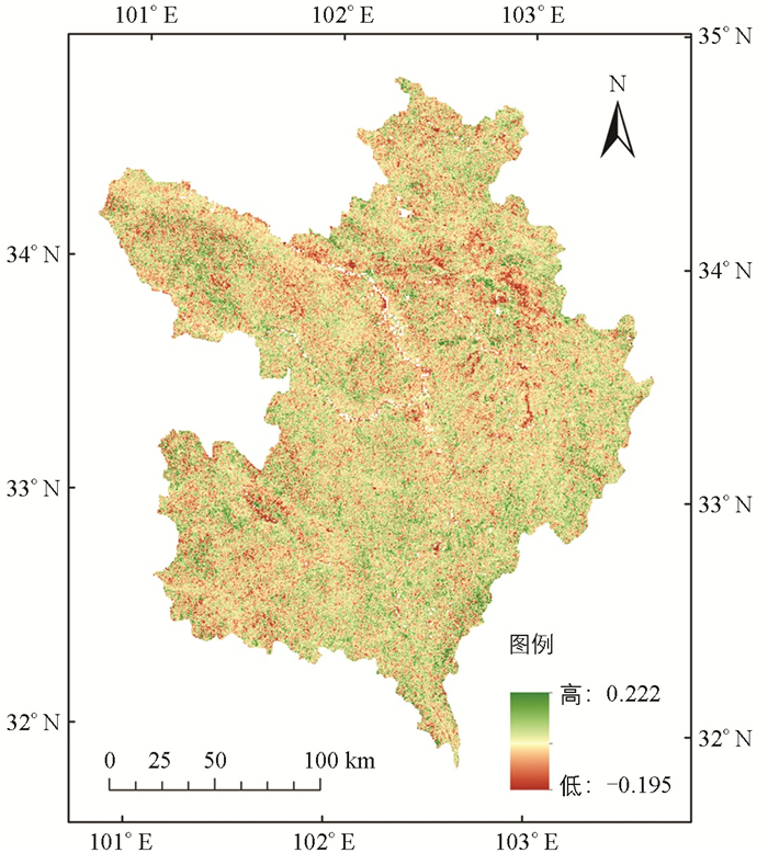 位于我国青藏高原东北缘的若尔盖草原是高寒湿地生态系统的关键构成部分,也是黄河上游重要的水源涵养地,具有极高的生物多样性和生态服务功能[19]。自20世纪60年代起,若尔盖草原出现明显的荒漠化现象,给该地区生态系统的稳定带来潜在威胁[20-22],不但危及黄河上游水资源的供应安全,更是对整个黄河流域的发展造成长远且不可忽视的影响[12, 23]。因此,开展若尔盖地区植被覆盖动态监测研究,对于预测评估气候变化下若尔盖草原生态系统的响应与适应能力,以及实现长期稳定和健康发展具有极为重要的理论和现实意义[24]。徐永明等[25]基于遥感数据建立了若尔盖高原1982-2013年的NDVI数据集。杨瑞瑞等[26]利用趋势分析、相关性分析等统计学方法分析了2000-2015年若尔盖地区植被覆盖度对气候因子的响应,讨论了气温和降水对植被覆盖度的驱动作用,结果显示仅7.85%的区域受到气候因子影响,剩余大部分区域的植被覆盖度表现为非气温和降水驱动。虽然此前针对若尔盖草原已有大量相关研究,但主要集中在土地荒漠化以及归一化差异植被指数的探讨上[27-28],在长时间序列的FVC及其背后驱动因素的研究则相对滞后。