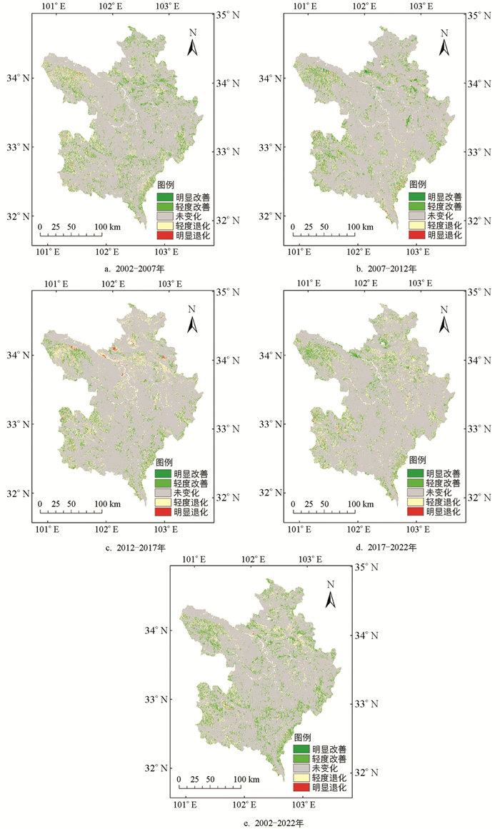 图 6展示了若尔盖草原2002-2022年不同时段内植被覆盖度的变化情况。整体来看,研究区内的草原生态系统在过去21年间呈现出相对稳定的态势;植被覆盖等级保持稳定的面积为35 124.29 km2,占总面积的83.28%;植被覆盖发生轻度退化和改善的面积分别为2 543.46 km2和4 314.07 km2,分别占比6.03%和10.23%;植被覆盖明显退化的区域仅为0.16%。2002-2007年植被覆盖得到改善的区域主要为中等植被覆盖区和较高植被覆盖区,全区之内广泛分布,以若尔盖县城北部及红原县中部地区最为集中,发生退化的区域仅占全区总面积的6.56%,且基本为较低植被覆盖区产生的轻度退化,集中分布于玛曲县域内海拔4 000 m以上的高原地区(图 6a)。2007-2012年,玛曲县北部、碌曲县西南部等地区的中等及以下植被覆盖区发生明显改善,总面积达137 km2,为各时段的最大值;而红原县东南部的高海拔地带分布有明显退化的区域,但占比极小,仅为全区总面积的0.18%(图 6b)。2012-2017年是唯一改善面积小于退化面积的时段,并且明显退化区域达到155 km2,为研究时段内的最大值,主要分布在若尔盖县城边缘及玛曲县北部的部分区域(图 6c)。2017-2022年若尔盖地区植被改善与退化的比例基本持平,占全区总面积的7%左右,但得到改善的区域多分布于碌曲县南部海拔3 000~3 500 m的地区,发生退化的区域多分布在若尔盖县中东部海拔3 000 m以下的草原地带(图 6d)。综合2002-2022年若尔盖地区植被覆盖情况的空间变化分布情况可以发现,中高海拔的山区和平原绿洲地带植被呈现出轻微改善的趋势,而若尔盖县城周边地区存在一定的退化现象(图 6e)。