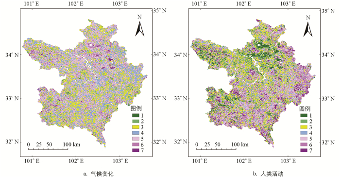 本研究分别对若尔盖草原植被覆盖改善和退化的驱动因素进行统计分析,结果表明,在气候变化和人类活动共同作用下,植物生长季FVC产生增长的区域占全区总面积的35.8%,致使植被覆盖减少的区域占全区总面积的35.3%,这表明气候变化和人类活动的共同作用是近21年来若尔盖地区FVC发生变化的主要原因。此外,单独由气候变化导致FVC增加的面积约占8.9%,主要分布于红原县中部及若尔盖县东北部海拔相对较低的区域,导致FVC减少的面积约占4.9%,在玛曲县和若尔盖县东部分布相对较多;单独由人类活动导致FVC产生增长和减小的面积分别约占9%和6%,多分布于研究区的东部区域(图 8)。
