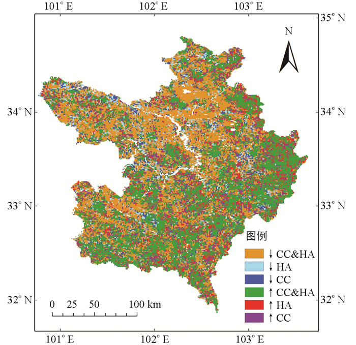 为判定气候变化和人类活动对植被覆盖度变化驱动的相对贡献,将结果分为两大不同类别:植被增加的区域和植被减少的区域。对于植被增加的地区,当FVCCC>0且FVCHA>0时,气候变化和人类活动都有助于植被增长;当FVCCC>0但FVCHA<0时,仅气候变化导致植被覆盖率增加;当FVCCC<0但FVCHA>0时,人类活动是扩大植被覆盖的唯一驱动力。对于植被减少的地区,当FVCCC<0且FVCHA<0时,气候变化和人类活动都会导致植被损失;当FVCCC<0但FVCHA>0时,气候变化仅导致植被覆盖率降低;当FVCCC>0但FVCHA<0的情况下,人类活动使得植被面积减少(表 3)[10, 18]