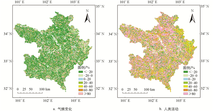 • 利用残差分析数据获得若尔盖草原植被生长季节气候变化和人类活动对FVC变化的相对贡献见图 9。气候变化对FCV变化贡献率为负值的总占比达到73.3%;其中贡献率小于-20%的占比最大,为60.6%,在玛曲县、阿坝县等地的高海拔山区多有分布;贡献率大于80%的面积占比次之,为14.2%,主要分布在若尔盖县周边地带,其他类别的贡献率占比较少;对植被覆盖贡献率为正值的占区域总面积的26.7%。人类活动对若尔盖草原FVC变化贡献为正值的区域面积为86.5%,贡献率大于80%的面积占比为46.5%,贡献率40%~60%、60%~80%以及小于-20%的3个区段的面积占比较大,多分布于研究区东北部海拔相对较低的区域,可以看出,在大部分范围内,人类活动对植被生长季FVC增长的相对贡献比气候变化高。