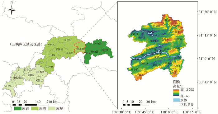 • 重庆市巫山县位于三峡库区腹心地带,介于东经109°33′-110°11′与北纬33°45′-31°28′之间,总面积为2 958.21 km2。县域常住人口46.35万人,涉及26个乡镇,340个村。气候温和,多年平均气温为18.4 ℃,属亚热带季风性气候;境内雨水充沛,多年平均降雨量为1 041 mm,降水多集中在夏季,常有暴雨,间有洪涝,且多伏旱;溪河众多,长江横贯东西。生物种类、矿产资源丰富。县境地质构造复杂,地势南北高而中间低,地形起伏较大,最高海拔为2 708 m,最低海拔仅有63 m,低值主要分布在县域中西部地区,高值主要分布在边缘地带。研究区所处三峡库区区位及高程如图 1所示。