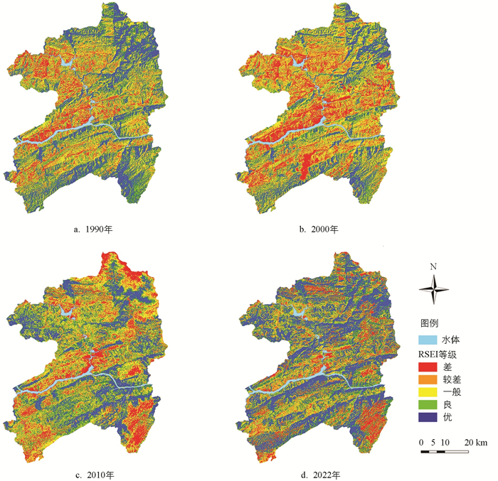 • 参考已有学者的分级标准[42],根据等间距法,以0.2为基准将1990-2022年4期归一化处理后的RSEI分为5个等级,即差[0~0.2)、较差[0.2~0.4)、一般[0.4~0.6)、良[0.6~0.8)、优[0.8~1]。RSEI各等级空间分布如图 2所示,各年份RSEI不同等级面积及比例见表 3