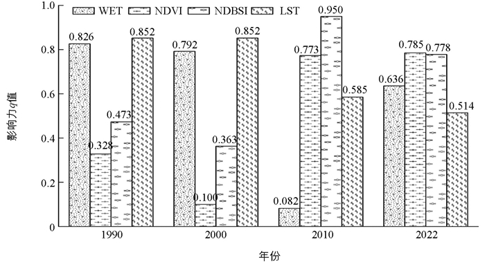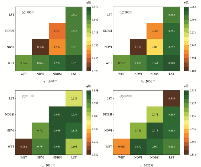 • 针对每期数据具体操作为:以RSEI作为因变量,各分量指标湿度(WET)、绿度(NDVI)、干度(NDBSI)和热度(LST)通过重分类由数值量转化为类型量后进行分层,作为自变量。之后以500 m×500 m范围,在ArcGIS 10.8软件中建立渔网进行均匀采样,去除异常值后,1990年为11 369个有效样本点,2000年为11 175个有效样本点,2010年为15 220个有效样本点,2022年为11 573个有效样本点。最后运用地理探测器方法进行主导因子分析,统计4个分量指标对RSEI的影响力值(q值),如图 4所示。