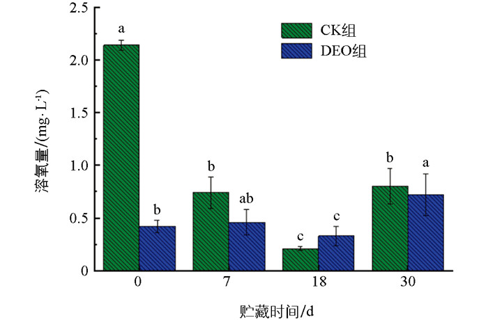 • 图 1  贮藏期间溶氧组(CK组)和脱氧组(DEO组)橙汁中的溶氧量