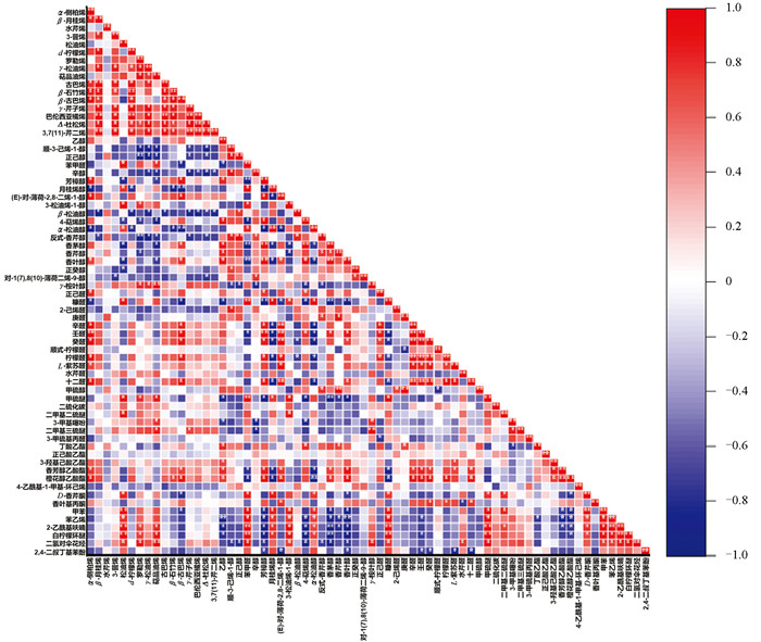 • 采用3种内标,即环己酮、甲基乙基硫醚和二异丙基二硫醚,分别对橙汁中挥发性非硫化物和挥发性硫化物进行定量分析。与贮藏初期相比,贮藏7 d后CK组橙汁中挥发性物质的质量分数升高了4.95%,而在18 d和30 d时分别降低了4.78%和1.77%;贮藏7 d和18 d时DEO组橙汁中挥发性物质的质量分数分别降低了12.86%和8.03%,在贮藏30 d时升高了4.29%,说明溶氧量可以影响橙汁中不同类型挥发性物质质量分数的占比。在贮藏初期,萜烯类是CK组和DEO组最主要的挥发性物质类型,分别占62.72%和60.67%;随着贮藏时间延长,在18 d时CK组和DEO组中萜烯类占比逐渐降低,CK组醇类和醛类占比逐渐升高,DEO组酮类占比逐渐升高,即CK组萜烯类占比降至41.56%,醇类和醛类占比分别上升至53.33%和3.03%;DEO组萜烯类占比下降至42.78%,酮类占比升至1.40%。d-柠檬烯、α-松油醇、芳樟醇、4-萜烯醇是橙汁中含量较高的挥发性物质,对橙汁风味具有重要的影响。相关性分析热图用于展示多个变量之间相关性的强度和方向,其中相关系数用于衡量两个连续变量之间的线性关系,其值为-1~1,-1表示完全负相关,1表示完全正相关,0表示没有线性相关。在橙汁贮藏过程中,各个挥发性物质的相关系数如图 2