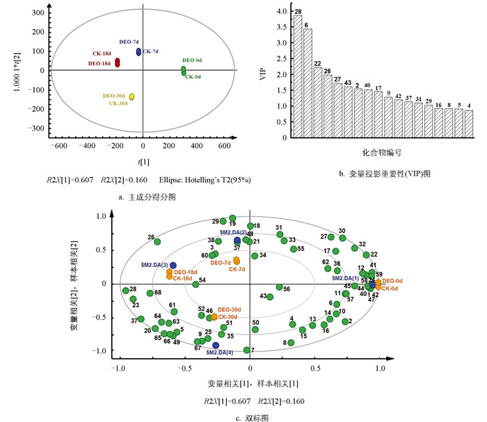 • 采用正交偏最小二乘法判别分析(Orthogonal Partial Least Squares Discriminant Analysis,OPLS-DA)的多元数据,解析CK组和DEO组橙汁在贮藏30 d内的风味品质变化规律,并筛选出贮藏期内橙汁中风味变化的关键标识物。图 3a显示,第1主成分和第2主成分分别占总变量的60.7%和16.0%。与贮藏初期相比,贮藏7 d和18 d时的橙汁中挥发性物质变化逐渐变大,而贮藏30 d时的橙汁中挥发性物质变化有变小的趋势,这可能与贮藏30 d时果肉中挥发性物质的释放有关。双标图(图 3c)可以表明挥发性物质和贮藏时间的关系,贮藏初期橙汁风味的呈现主要与癸醛、十二醛、(E)-对-薄荷-2,8-二烯-1-醇、辛醛、柠檬醛、α-侧柏烯、橙花醇乙酸酯和芳樟醇有关;贮藏18 d的橙汁风味呈现主要与α-松油醇、糠醛、月桂烯醇、2,4-二叔丁基苯酚和β-松油醇有关;贮藏30 d的橙汁风味呈现主要与水芹醛、3-甲基噻吩、二甲基二硫醚、γ-桉叶醇和3-松油烯-1-醇有关。通常变量投影重要性(Variable Importance in Projection,VIP)大于1时被认为是筛选标记物的临界值[32],结果如图 3b,14个风味标识物被筛选,即α-松油醇、d-柠檬烯、芳樟醇、β-松油醇、4-萜烯醇、顺式-柠檬醛、β-月桂烯、辛醛、乙醇、萜品油烯、癸醛、糠醛、香芹醇和反式-香芹醇,可以区分不同贮藏期橙汁风味品质的变化。