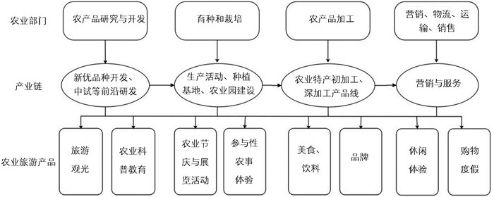 农业与旅游业融合发展模式如图 1所示。农业与旅游业融合作为一种典型的交叉型融合模式,既是休闲、体验、观光等农业功能在旅游产业链中的应用[7],也是旅游休闲功能在农业产业链中的发挥[8]。在农业与旅游业融合中农业改变旅游产业链的创新,主要体现为将一般农业部门和产业链要素挖掘转化为具有吸引力的旅游资源;旅游业改变农业的创新,主要体现为旅游休闲农产品的开发、生产以及依托传统农业资源逐渐拓展的农业休闲、观光、体验等新型产业形态。这种基于交叉整合产业资源的农产品,扩大了现有农产品的种类,也改变了这些产业原有产品的功能,同时逐渐衍生出与农业相关的配套服务,扩大了农业的多功能性,也可以看作是农业功能扩展的融合模式。
