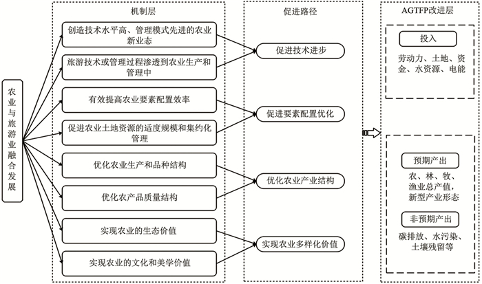 农业与旅游业融合发展对AGTFP的影响机制如图 2所示。农业与旅游业融合不仅对乡村经济发展具有促进作用,而且对提高农业旅游生产力具有正向影响,主要体现在以下几个方面。