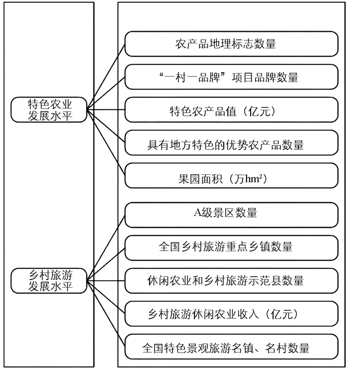 农业与旅游业融合水平测度指标如图 4所示。农业与旅游业融合发展是指围绕某一主题或区域形成特色农业和旅游品牌的过程。围绕农业地理标志形成的农业旅游小镇、旅游重点村、休闲农业、乡村旅游示范县等特色农业旅游品牌最能体现农业与旅游业融合发展的特征和要素。本研究选取5个指标测度特色农业发展水平,另选取5个指标测度乡村旅游发展水平。