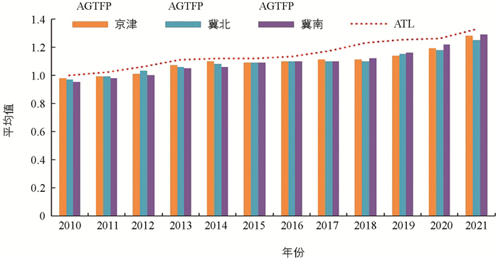 2010-2021年京津冀区域ATL与AGTFP平均值变化趋势如图 5所示。为分析ATL与AGTFP之间的关联,本研究采用耦合协调度模型与Super-SBM模型对二者进行了测度。
