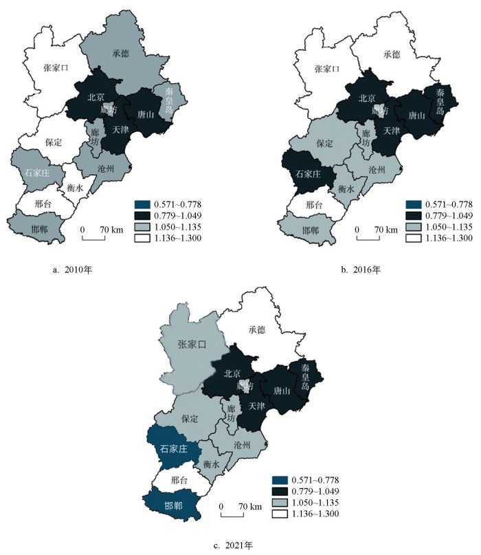为了更全面地分析农业绿色全要素生产率的动态演变情况,采用ArcGIS中的自然断点法对京津冀区域13个地市的AGTFP平均值进行划分,将区域划分为高效率区(1.136≤AGTFP≤1.300)、较高效率区(1.050≤AGTFP≤1.135)、中等效率区(0.779≤AGTFP≤1.049)、较低效率区(0.571≤AGTFP≤0.778)共4种类型。本研究选取2010年、2016年、2021年京津冀区域AGTFP空间分布特征(图 6),展现AGTFP的动态演变过程。
