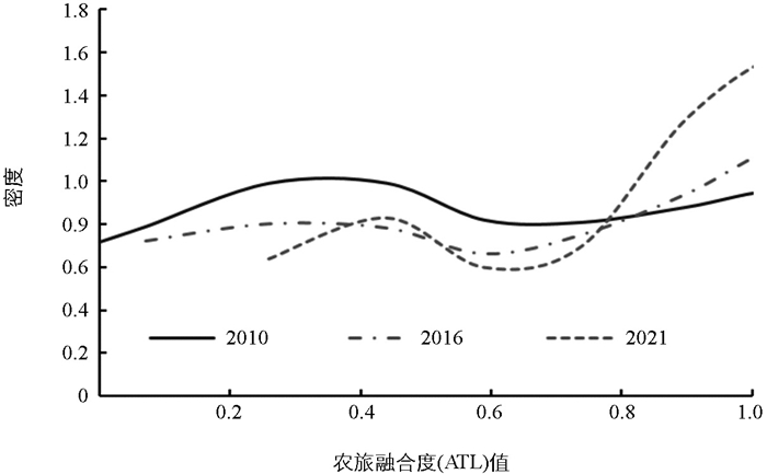 京津冀区域农业与旅游业融合度分析如图 7所示。本研究采用高斯核密度函数,以2010年、2016年和2021年为参考点,对京津冀区域农业与旅游业融合度(ATL)的分布动态进行估计。分析发现,该区域ATL整体呈现出稳定的“双峰”分布特征,表明高低两级分化明显。第一波峰值位于0.2~0.6区间,第二波位于0.8~1.0区间,两区间城市数量基本相当。从时间演变来看,与2010年基准相比,后续2年核密度曲线整体呈现右移趋势,其中2016年略微右移,2021年右移幅度更为显著,反映出ATL水平在研究期内逐步提升,且后期增速加快。同时,波峰高度增加,宽度收窄,说明ATL整体上升且分布更为集中,区域平均融合水平有所提高。然而,高值与低值之间的差距仍然突出,两极分化现象持续存在,这可能与区域间经济发展、政策支持及基础设施等因素的差异有关。