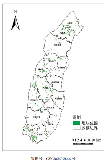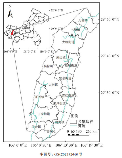 • 重庆市璧山区地处长江经济带、成渝经济圈,规模化种植业主多,劳动力较少。为追求利润最大化,业主一般会选择化肥等种植业投入品。此外,璧山区地貌总轮廓为“两山夹一谷”,境内地貌按其海拔高度和分布位置,可分为低山、丘陵和宽谷,为典型的丘陵山区。全区农村占比高、坡耕地多、降水集中等导致污染分布广、威胁大、动能强,化肥、农药更容易受到降雨、地形等因素的驱动进入周边水体产生面源污染,如图 1。研究涉及规模化种植地块如图 2所示。
