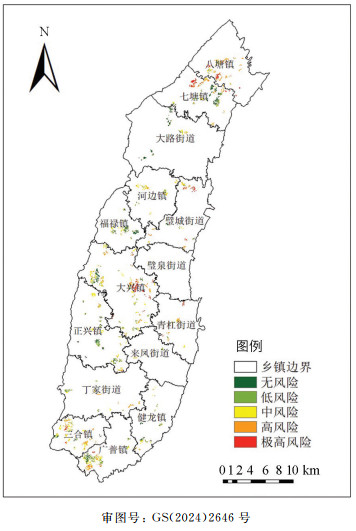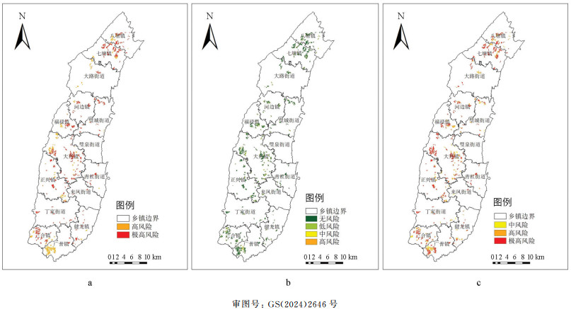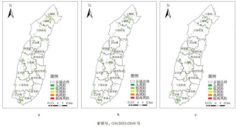 • 由水域距离分析结果(图 5c)可以看出,重庆市璧山区规模种植主体地块水体距离整体较近,其中69.43%的地块处于极高风险,27.91%的地块处于高风险,2.66%地块处于中风险。