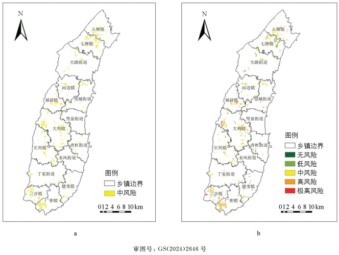 • 本研究测算了重庆市璧山区规模种植地块土壤可蚀性指数,由图 5a可知,璧山区整体以极高风险为主,高风险为辅,其中68.36%的地块为极高风险,31.64%地块为高风险。