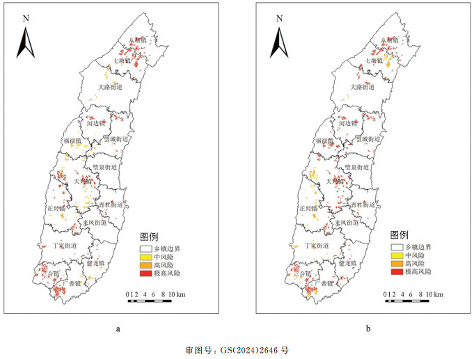 • 林草滞纳指数结果如图 6a所示,重庆市璧山区整体以极高风险为主,高风险次之,中风险最少,其中73.98%处于极高风险,22.54%处于高风险,仅3.48%处于中风险。