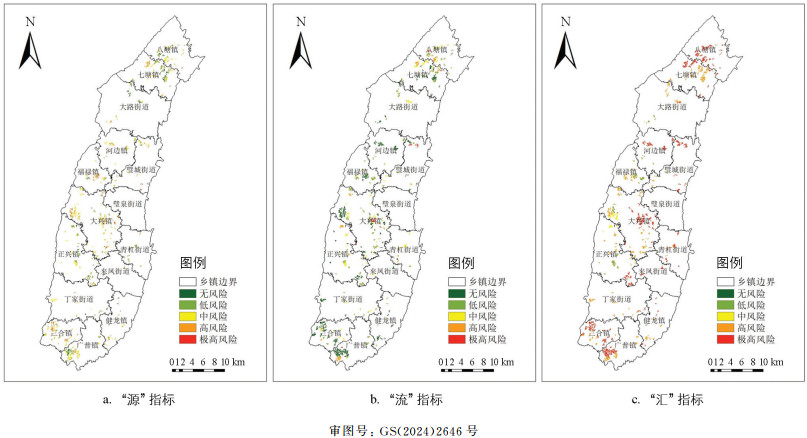 • 重庆市璧山区规模化种植地块各分项指标风险评估结果如图 7所示,除“汇”指标风险呈现极高风险外,其他指标风险均相对较低。其中,“源”指标以无风险为主,“流”指标以中风险为主,“汇”指标以高风险/极高风险为主。“源”指标中24.06%为低风险,15.37%为中风险,11.44%为高风险,4.77%为极高风险;“流”指标中29.41%为低风险,35.81%为中风险,21.04%为高风险,4.94%为极高风险;“汇”指标中8.98%为低风险,3.85%为中风险,37.15%为高风险,49.90%为极高风险。