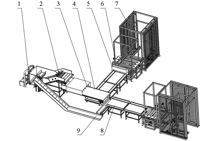 基于桑叶育的养蚕装备结构如图 1所示,主要由桑叶输送系统与蚕盘输送系统2部分组成。桑叶输送系统包括桑叶上料机构、桑叶输送带、桑叶回收机构、赶料辊和拨桑机构;蚕盘输送系统包括蚕盘升降堆垛机、蚕盘拆分机构、石灰机和蚕盘输送机构。